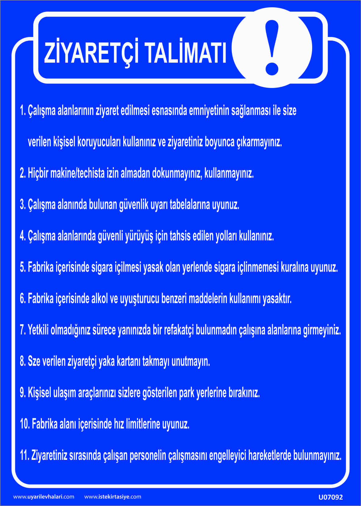 İşletmelere gelen ziyaretçilerin uyması gereken kuralları belirtmek için tasarlanmış bilgilendirici bir uyarı levhasıdır. Güvenlik, düzen ve işleyiş açısından kritik olan ziyaretçi talimatlarını net bir şekilde gösterir ve giriş noktalarında dikkat çekici bir uyarı sağlar.